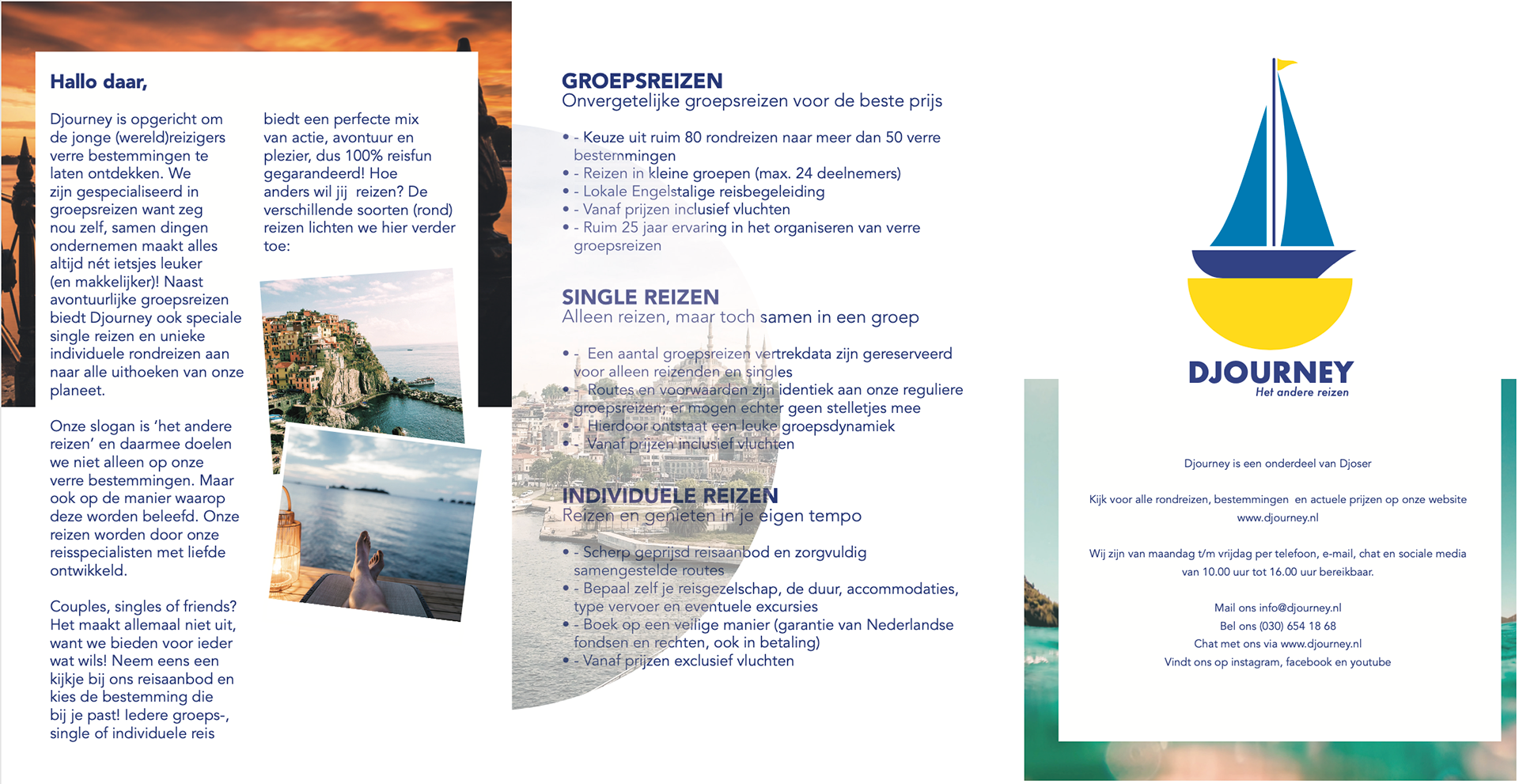 Djourney is een deel van Djozer, een reisbureau. Djourney organiseert rondreizen voor jongeren van 18 tot 35 jaar. Ik heb een logo, app, folder en correspondentieset gemaakt voor dit nieuwe Djozer-concept.